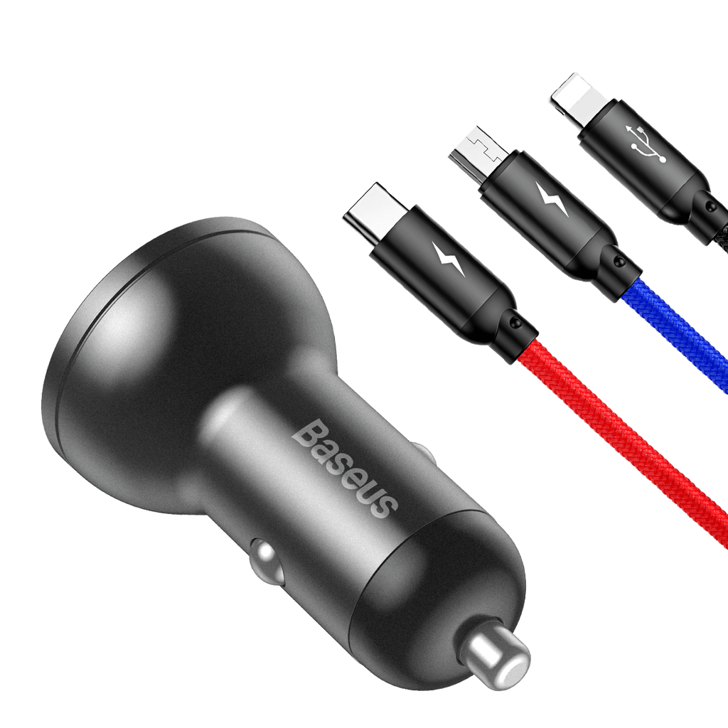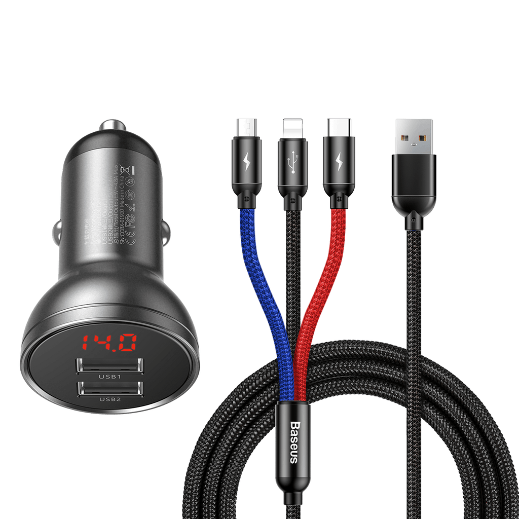 Baseus 3-in-1 Car Charger Suit - Digital Display Dual USB, Cable USB 1.2M