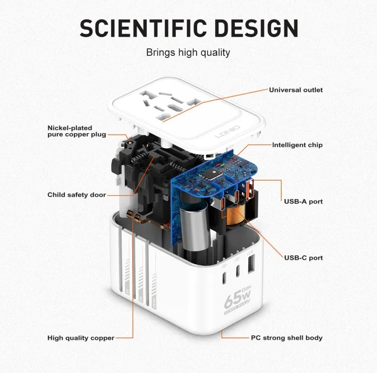 Ldnio Z6 Worldplug All in One Travel Charger, 3 USB Ports, 65W GaN Travel Multi Plug Adapter with Type C Charging